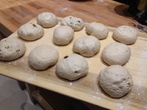 Fruits and nuts all incorporated, letting the balls of dough rest before shaping them into the batard shape which looks like a football.
