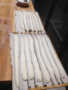 Rolling and shaping the baguettes, allowing them to rest on a couche cloth. On the bottom right, the batards resting.