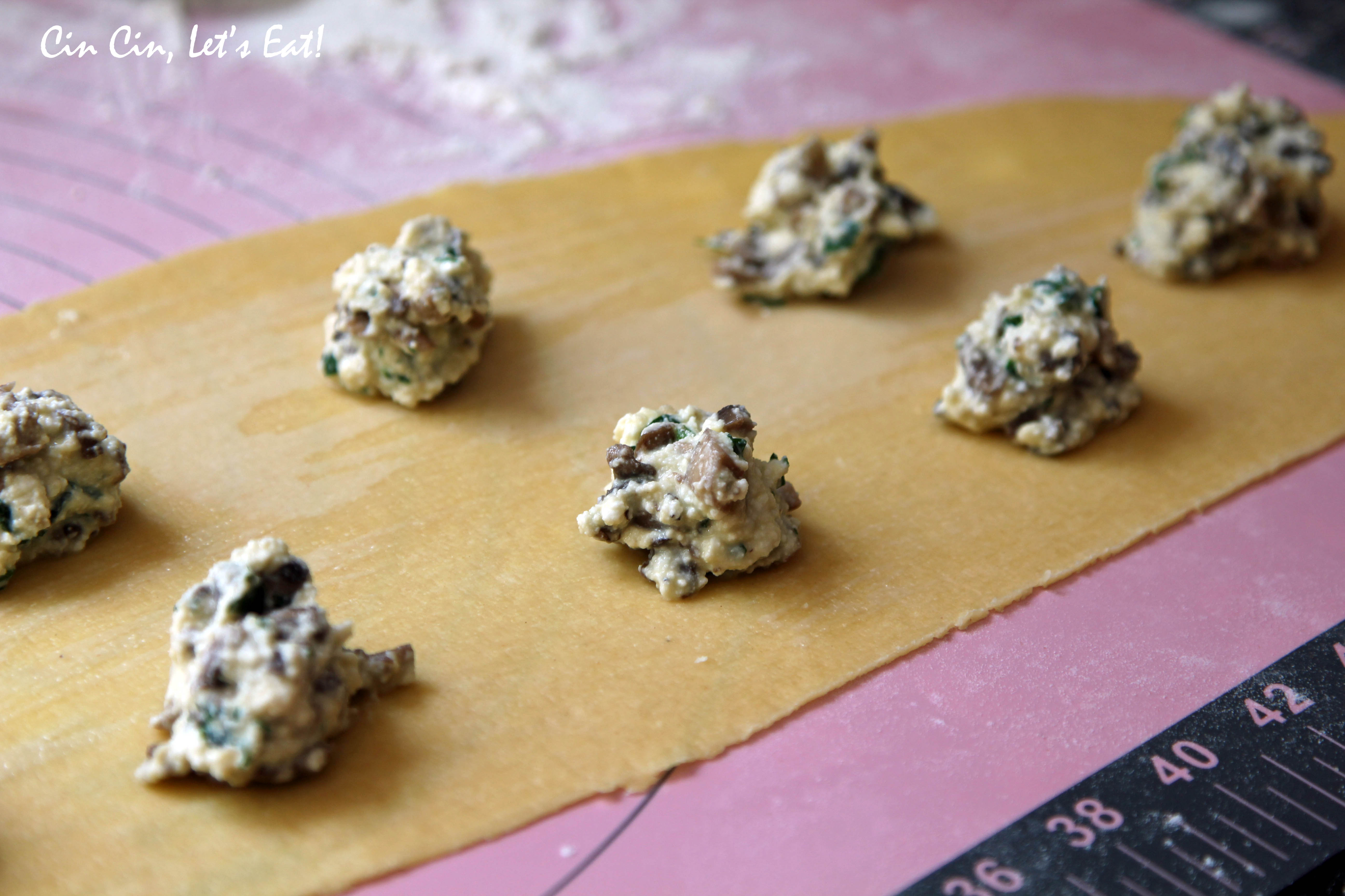 I cooked a small batch right after and had the biggest smile on my face. The rests were dusted with tons of flour and refrigerated overnight. The next day when it was time to cook, all of the ravioli were stuck together! You can imagine how terrified and angry I was. I went into panic mode and carefully peeled each one away from one another. Yes, it took forever to do that. My guests arrived and I was still cursing while separating the ravioli…. But thanks to all the encouragement, I was able to cook all the now stretched-out and ugly ravioli and finished them in a simple mushroom cream sauce (saute sliced mushroom and garlic with butter, lemon juice, red pepper flakes, a touch of cream, and season). They still tasted awesome despite the fact that they now look like wrinkly wontons.