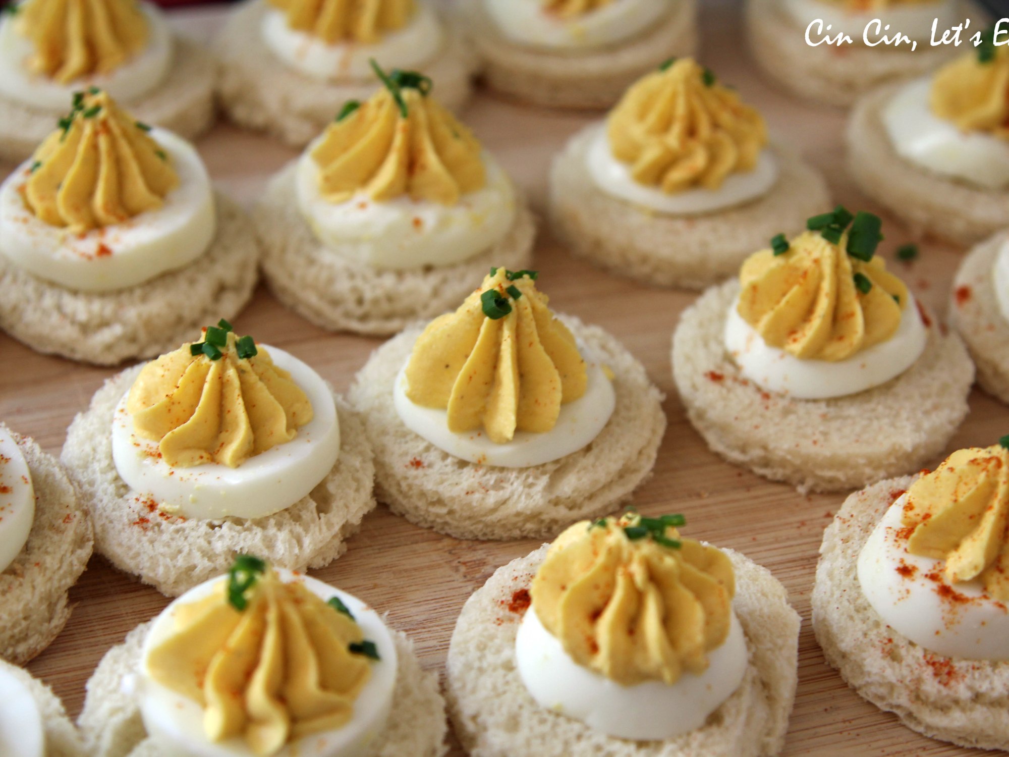 - Peel the eggs. Slice each egg into 6-8 slices, crosswise. Use an egg slicer for more uniformed slices. Gently remove the yolks and place in a small mixing bowl, reserve the rings of egg whites. Using a fork, mash up the yolks and add mustard, mayonnaise, onion powder, Tabasco, and a sprinkling of salt and pepper. Put the mixture in a piping bag fitted with a star tip. Refrigerate until ready to use.