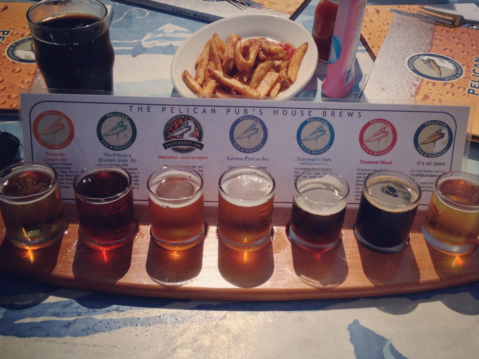 Another 15 minutes driving south along the coast, we have arrived at Pelican Brewery and Pub in Pacific City. It was such a beautiful day with a perfect and Sunny 75F, we scored a table outside and enjoyed a great view of the sandy beach, the cape, and the magnificent haystack rock. We ordered a couple of the beer sampler (not listed on menu) with a plate of beer-battered fries (fried to crispy perfection), it’s $7 for 3oz tasters of each of their 6 beers plus 1 seasonal beer. My favorites were the Scottish Ale and the Creamy Stout. Each of the food items on the menu (including desserts) are made with Pelican’s own beer, everything sounded delicious but we already made dinner plan elsewhere.